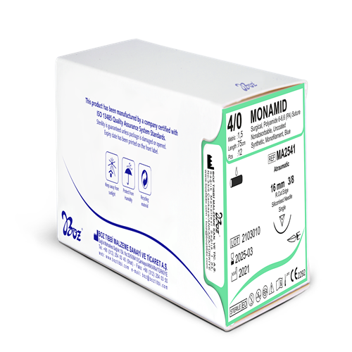 BOZ 4.0 Keskin Monamid Sütur, cerrahi uygulamalarda yüksek dayanıklılık, pürüzsüz geçiş ve minimum doku travması sunan sentetik, emilmeyen monofilament bir sütur ipliğidir.
