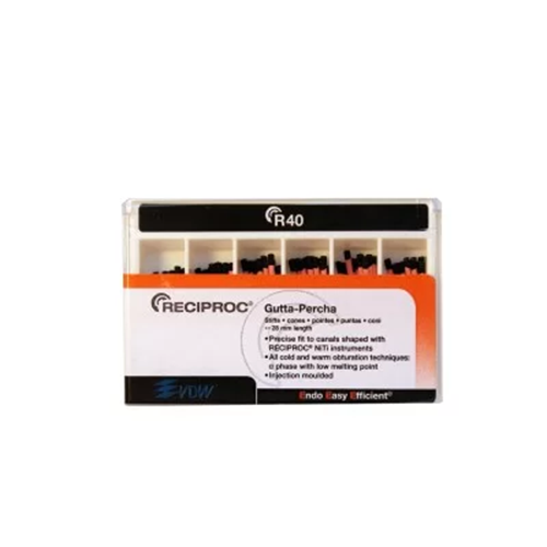 Gutta Reciproc R 40, endodontik tedavilerde kanal şekillendirme ve doldurma işlemleri için tasarlanmış yüksek kaliteli bir gutta perka ürünüdür. R 40 boyutu, geniş kanal yapıları için ideal olup, Reciproc sistem ile tam uyum sağlar. Esnek ve dayanıklı yapısı, güvenli ve etkili uygulama imkanı sunar.